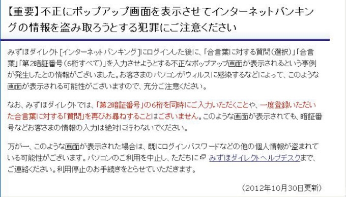 重要 みずほダイレクトにおいて 第2暗証番号6桁を盗み取ろうとするウィルスにご注意ください みずほ銀行